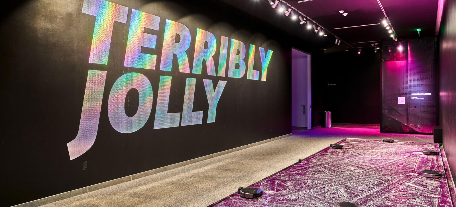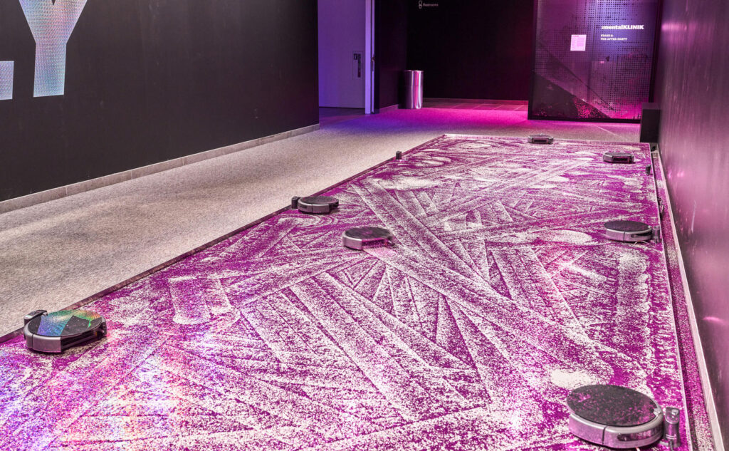 A floor strewn with pink glitter is attended to by a fleet of robot vacuums, suggesting that a party has already transpired. Yet the vacuums themselves engage in a kind of dance, kicking up little clouds of glitter as they crisscross the floor, as if standing in for absent revelers. Tracks left in the blanketing of glitter are soon obliterated by more tracks, meaning the work is constantly in flux, and is never the same twice.